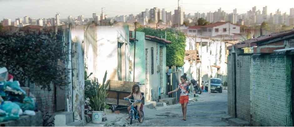 two girls in street. One one buke and other walking. in slum community
